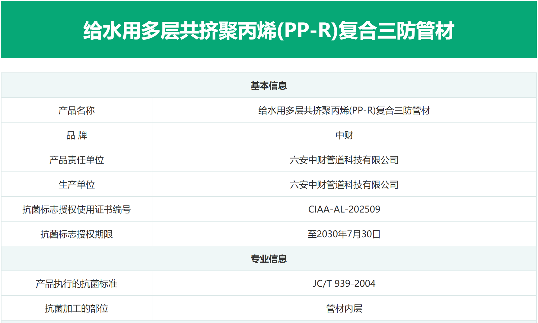日前,六安中財(cái)管道科技有限公司研發(fā)生產(chǎn)的給水用多層共擠聚丙烯(PP-R)復(fù)合三防管材通過(guò)CIAA的嚴(yán)苛審核,獲得抗菌標(biāo)志使用授權(quán)。這意味著給